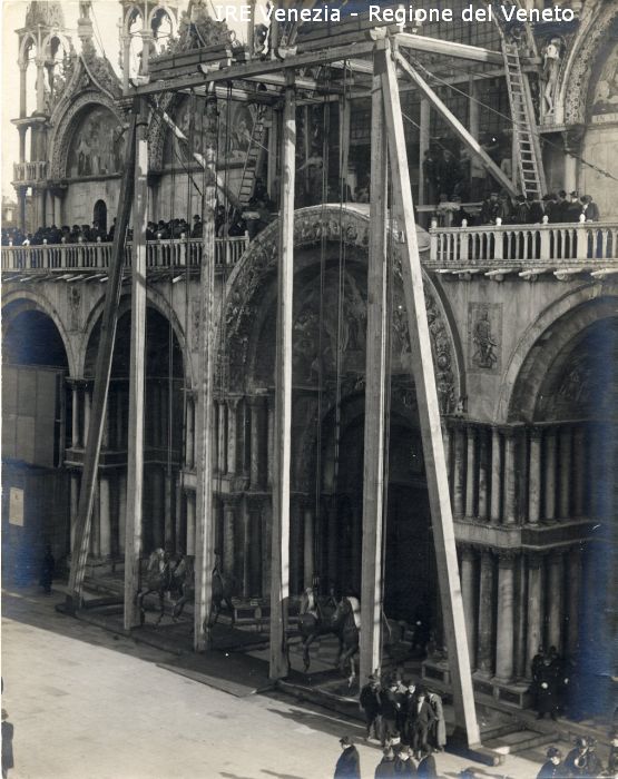 Venezia - Vita veneziana e lagunare - Prima guerra mondiale - Opere pubbliche - Opere di protezione - Ricollocazione dei cavalli marciani: cavalli pronti per essere issati sulla loggia della Basilica di S. Marco
