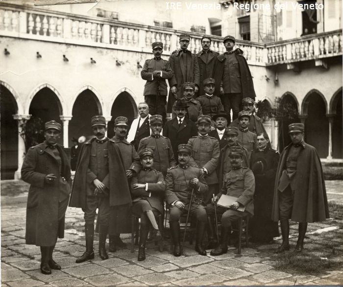 Venezia - Vita veneziana e lagunare - Prima guerra mondiale - Assistenza e Sanità - Ospedali militari - Liceo Marco Foscarini: esterno - Gruppo in posa: direzione e dottori, uomini in uniforme militare