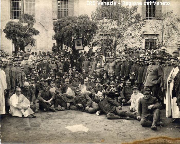Venezia - Vita veneziana e lagunare - Prima guerra mondiale - Assistenza e Sanità - Ospedali militari - Liceo Marco Foscarini: esterno - Gruppo in posa: Presidenza, Direzione, Dottori, Primari, Dame della Croce Rossa, Feriti di guerra