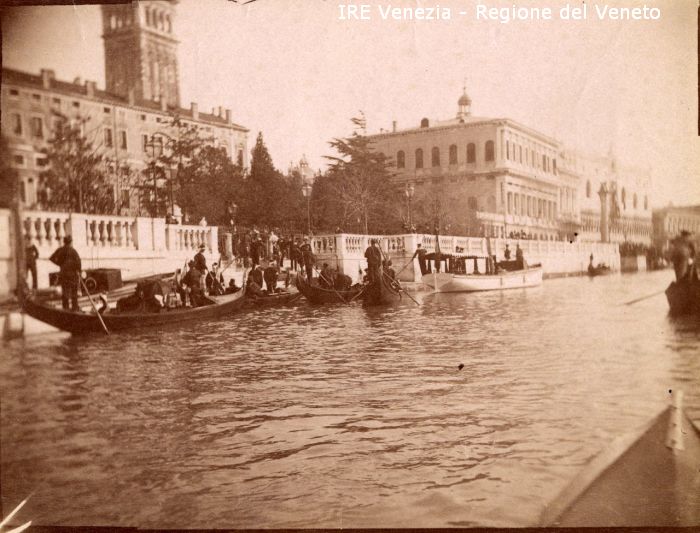 Venezia - Vita veneziana e lagunare - Scene e costumi - Cronaca ed eventi - Bacino di S. Marco - Gondole e lance all'ingresso acqueo del Palazzo Reale - Persone