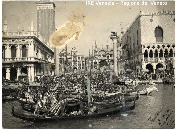 Molo e Piazzetta di S. Marco: ripresi dal Bacino - Imbarcazione: gondola, galeone - Comparse in costume settecentesco - Palazzo Ducale addobbato a festa - Stendardi e bandiere