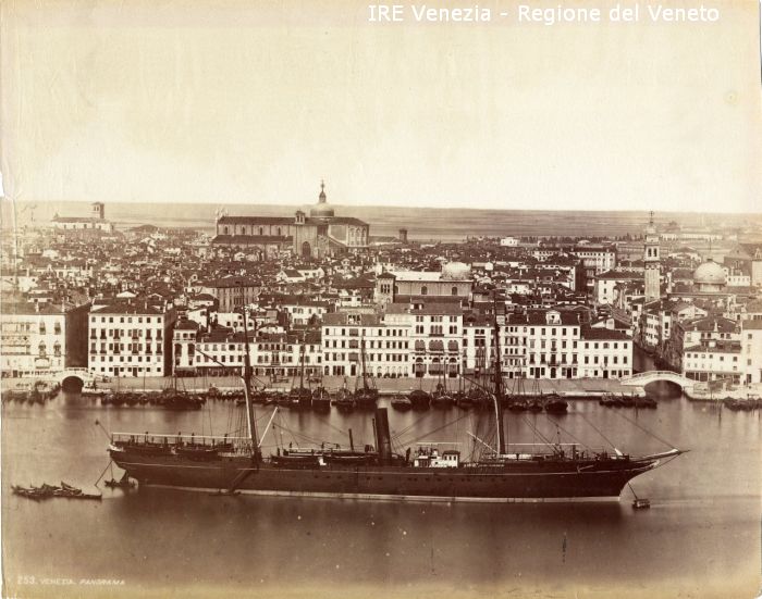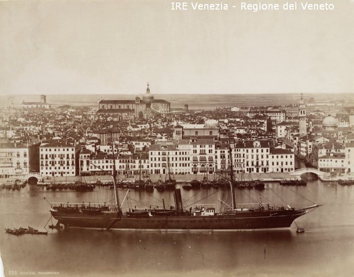 Venezia - Vedute, monumenti, luoghi - Centro storico - Bacino di S. Marco: ripreso dal Campanile della Chiesa di S. Giorgio Maggiore - Imbarcazioni - Battello della Compagnia Peninsulare
