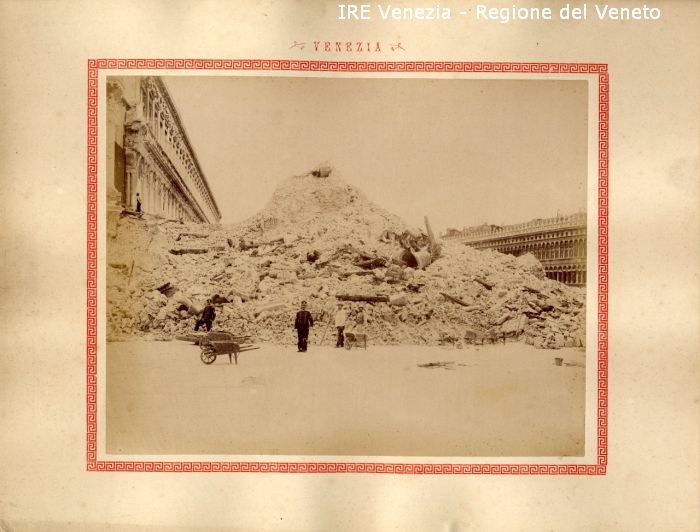 Venezia - Vita veneziana e lagunare - Attività pubbliche - Opere pubbliche - Campanile di S. Marco dopo il crollo: macerie in Piazza S. Marco - Uomini in uniforme - Operai al lavoro
