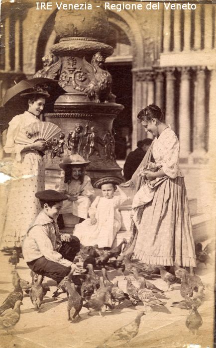 Venezia - Vita veneziana e lagunare - Scene e costumi - Piazza S. Marco - Pilo portabandiera - Tre bambini e due donne che danno da mangiare ai piccioni