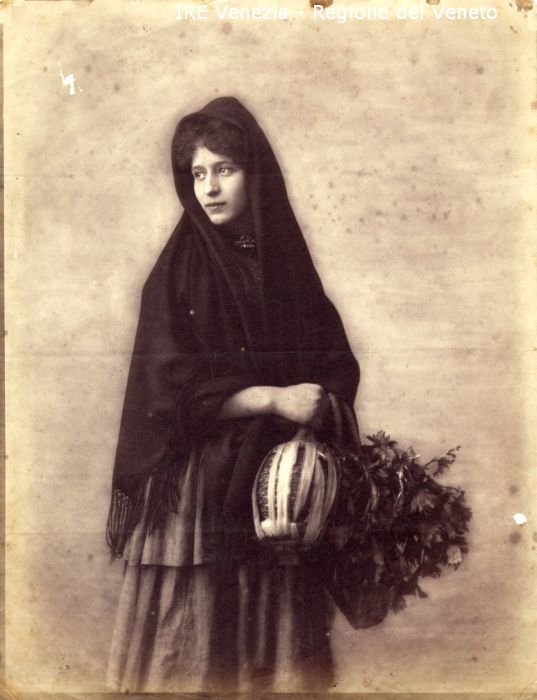 Venezia - Vita veneziana e lagunare - Scene e costumi - Scene di genere - Modella in posa: in studio; in foggia di popolana - Avvolta in uno scialle nero - Fiasco di vino - Cesto con ortaggi