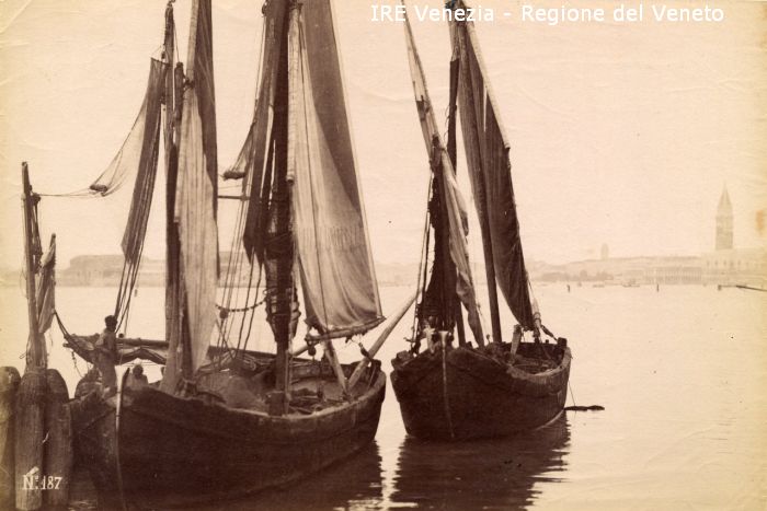 Venezia - Vita veneziana e lagunare - Scene e costumi - Pescatori e imbarcazioni da pesca: nel Bacino di S. Marco - Veduta del Bacino dalla Riva dei Sette Martiri - Imbarcazioni da pesca - Pescatori