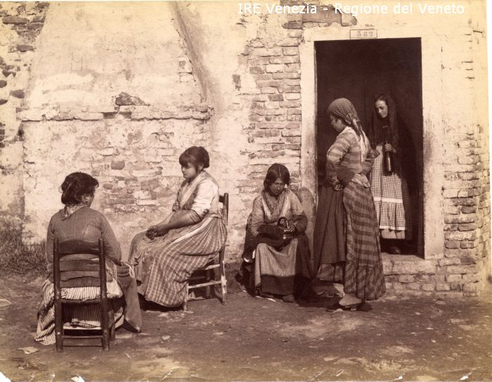 Venezia - Vita veneziana e lagunare - Scene e costumi - "D'après nature" - Momenti di vita quotidiana - Luogo non identificato - Esterno di povera abitazione - Popolane - Conversazione