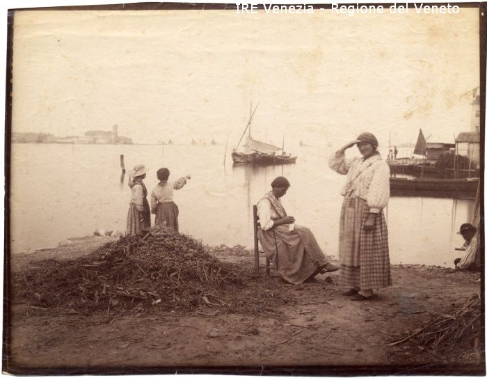Venezia - Vita veneziana e lagunare - Scene e costumi - "D'après nature" - Territorio di Chioggia - Sottomarina - Riva sulla Laguna - Donne - Conversazione - S. Domenico sullo sfondo