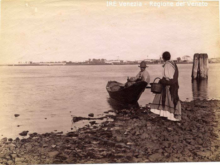 Venezia - Vita veneziana e lagunare - Scene e costumi - "D'après nature" - Pescatori e imbarcazioni da pesca - Laguna di Venezia: barena - Veduta verso il Lido - Pescatore: che traina un sandolo a terra
