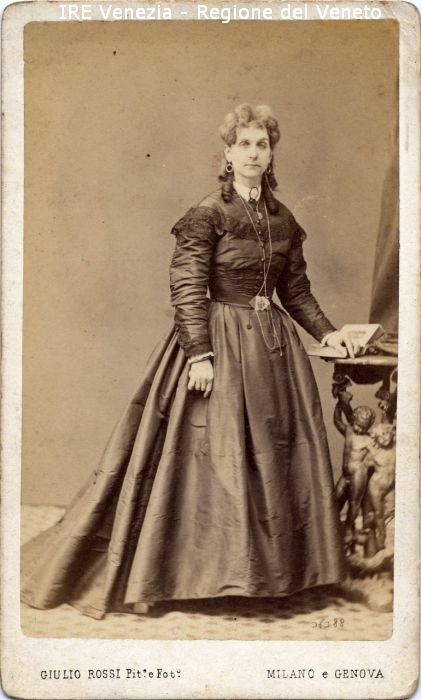 Ritratti: in studio; figura intera; in semi profilo - Donna; in piedi, con la mano sinistra poggiata su un libro - Acconciatura: boccoli - Vestiario: abito scuro - Gioielli: orecchini d'oro, spilla con cammeo