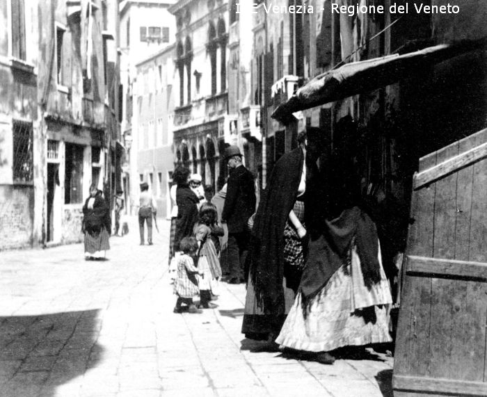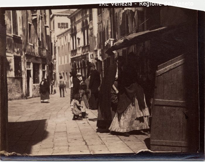 Venezia - Vita veneziana e lagunare - Scene e costumi - Mercato, negozi, bancarelle - Calle non identificata (Salizzada S. Pantalon?) - Bottega - Acquirenti - Passanti