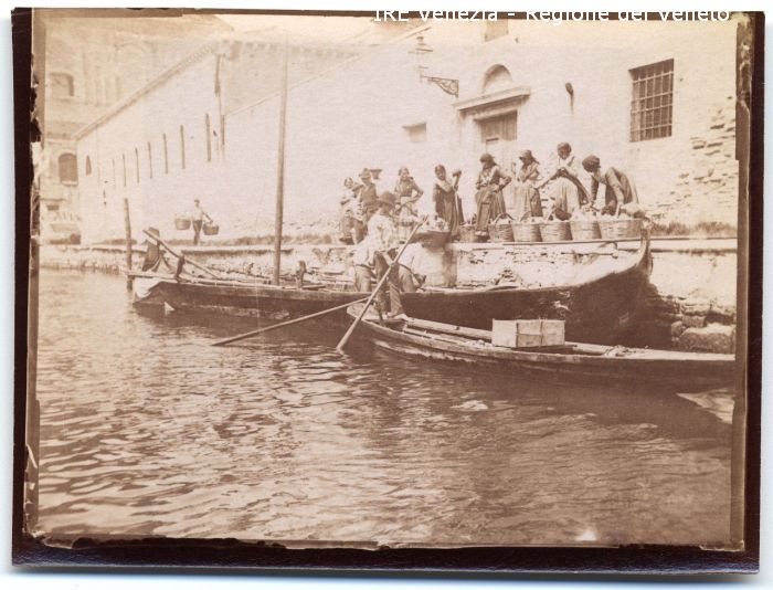 Venezia - Vita veneziana e lagunare - Scene e costumi - Momenti di vita quotidiana - Fondamenta non localizzata ( Misericordia ?) - Donne su una riva - Ceste con ortaggi - Imbarcazione: peata