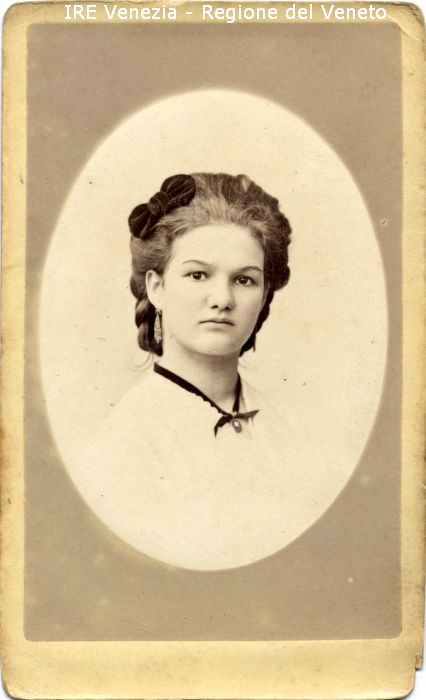 Ritratti: in studio; mezzo busto; in semi profilo - Donna - Acconciatura: capelli raccolti con un fiocco scuro - Vestiario: camicia bianca - Gioielli: orecchini, collana - Sfondo