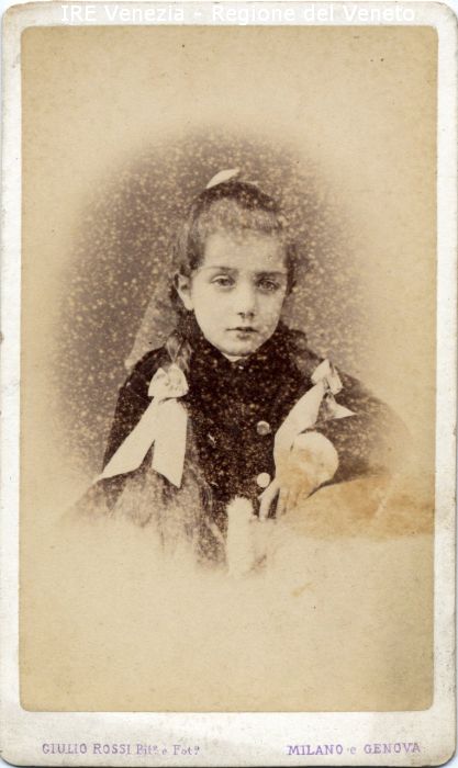 Ritratti: in studio; mezzo busto; frontale - Bambina - Acconciatura: due lunghe trecce legate con nastrini bianchi - Vestiario: abito scuro - Sfondo