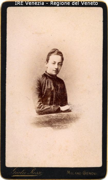 Ritratti: in studio; busto intero; in semi profilo - Donna; in piedi, con il braccio destro poggiato su un ripiano - Acconciatura: capelli raccolti a chignon - Vestiario: abito scuro - Gioielli: collana di perle - Sfondo