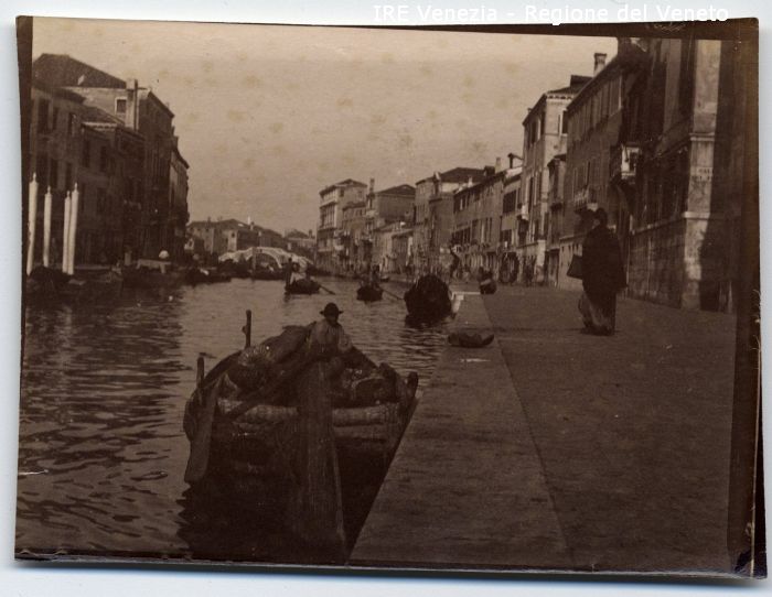 Venezia - Vita veneziana e lagunare - Scene e costumi - Mercato, negozi, bancarelle - Fondamenta di Cannaregio: verso il ponte dei Tre Archi - Barcone di fruttivendolo - Passanti