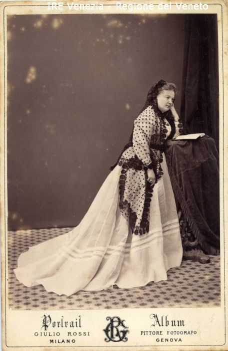 Ritratti: in studio; figura intera; in semi profilo - Ritratto della cantante lirica Carolina Vesselie - Donna; in piedi, con il braccio sinistro poggiato su un tavolino e il viso poggiato sulla mano sinistra