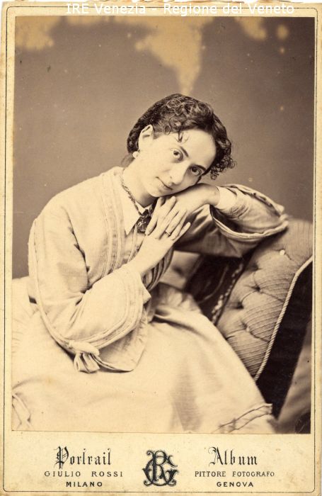 Ritratti: in studio; mezza figura; in semi profilo - Ritratto di Adele Mosconi, allieva emerita della R. Scuola di Ballo del Teatro alla Scala, Milano - Donna; seduta, con le mani intrecciate e il viso poggiato sulle mani
