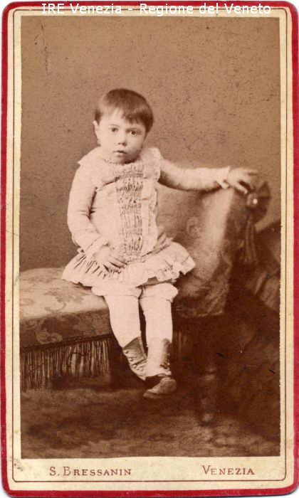 Ritratti: in studio; figura intera; frontale - Bambina; seduta, con il braccio sinistro poggiato sul bracciolo di una chaise-longue - Abbigliamento: abito bianco, scarponcini con ghette - Gioielli: orecchini