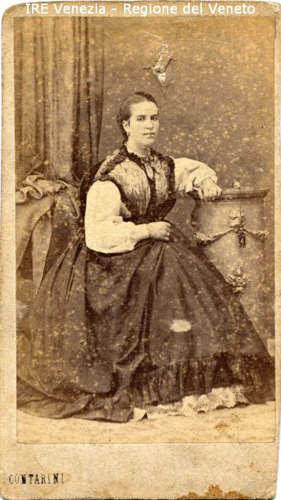 Ritratti: in studio; figura intera; in semi profilo - Donna; seduta, con il braccio sinistro poggiato su una colonnina - Vestiario: abito scuro, camicia bianca - Gioielli: orecchini, vera