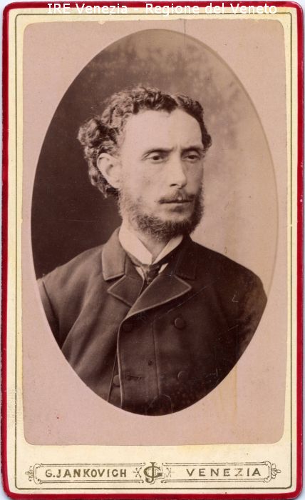 Ritratti: in studio; mezzo busto; in semi profilo - Uomo: con baffi e barba - Vestiario: giacca scura, camicia bianca, cravattino - Sfondo