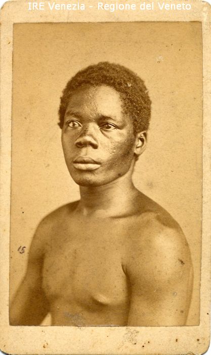Ritratti: in studio; mezzo busto; in semi profilo - Uomo: di razza africana; a torso nudo - Sfondo