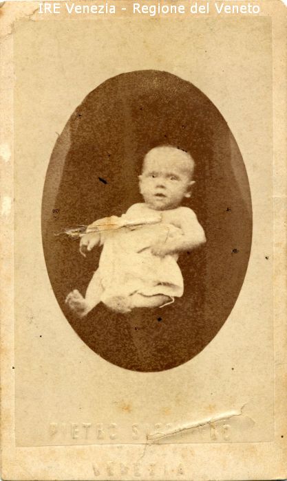 Ritratti: in studio; figura intera; frontale - Neonato - Vestiario: abito bianco - Sfondo