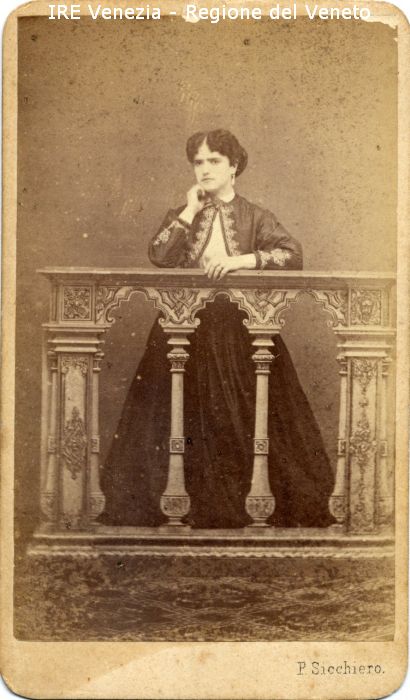 Ritratti: in studio; figura intera; frontale - Donna; in piedi, poggiata a una balaustra - Acconciatura: capelli raccolti a chignon - Vestiario: gonna scura, camicia bianca, giacca ricamata - Gioielli: orecchini