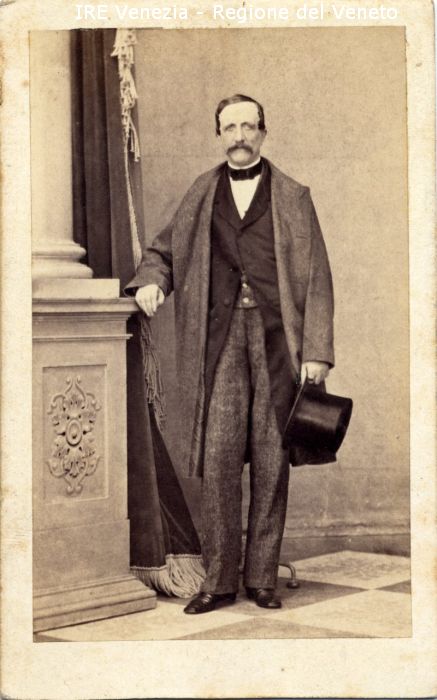 Ritratti: in studio; figura intera; frontale - Uomo: con baffi; in piedi, con la mano destra appoggiata a una colonna ed un cappello a cilindro nella mano sinistra - Vestiario: cappotto, giacca scura, gilèt, camicia bianca; cravattino