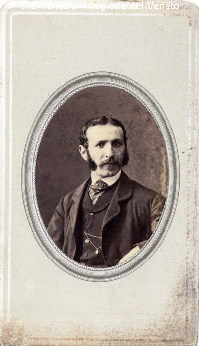 Ritratti: in studio; mezzo busto; in semi profilo - Ritratto di Francesco Herchele - Uomo: con baffi e basette - Vestiario: cappotto, giacca, camicia bianca, cravattino a pois; orologio da taschino - Sfondo