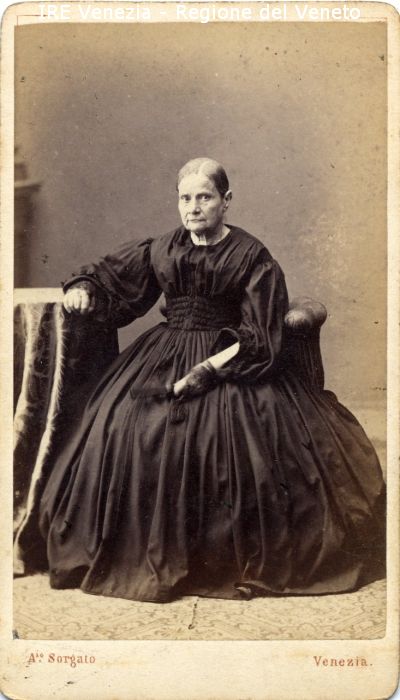 Ritratti: in studio; figura intera; frontale - Ritratto della marchesa Bandiera - Donna: anziana; seduta - Vestiario: abito scuro - Arredamento: tavolo, poltroncina - Sfondo