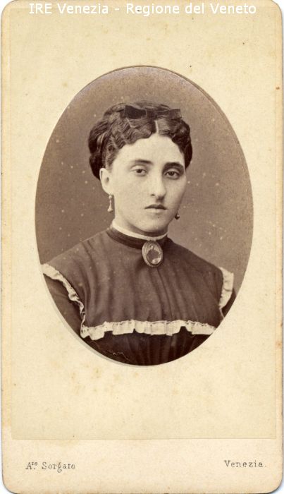 Ritratti: in studio; mezzo busto; frontale - Donna - Acconciatura: capelli ondulati, frontino con fiocchetto - Vestiario: abito scuro con volant di pizzo bianco - Gioielli: orecchini, spilla con ritratto maschile - Sfondo