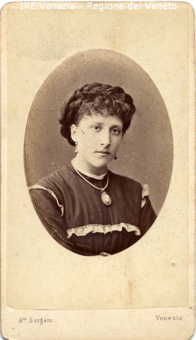 Ritratti: in studio; mezzo busto; frontale - Donna - Acconciatura: capelli ricci, frontino con fiocchetto - Vestiario: abito scuro con volant di pizzo bianco - Gioielli: orecchini, collana con ciondolo a cammeo - Sfondo