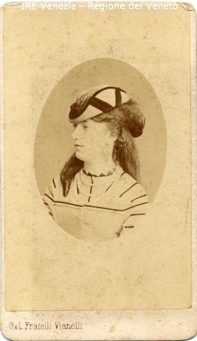 Ritratti: in studio; mezzo busto; di profilo - Donna - Acconciatura: capelli lunghi - Vestiario: abito chiaro; cappello - Gioielli: collana di perle - Sfondo