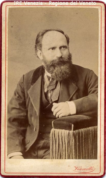 Ritratti: in studio; busto intero; in semi profilo - Ritratto di Angelo Negretto, di Lavadina - Uomo: con baffi e barba; seduto, con il braccio sinistro appoggiato sul brocciolo di una sedia - Vestiario: giacca, gilèt, camicia, cravatta - Sfondo