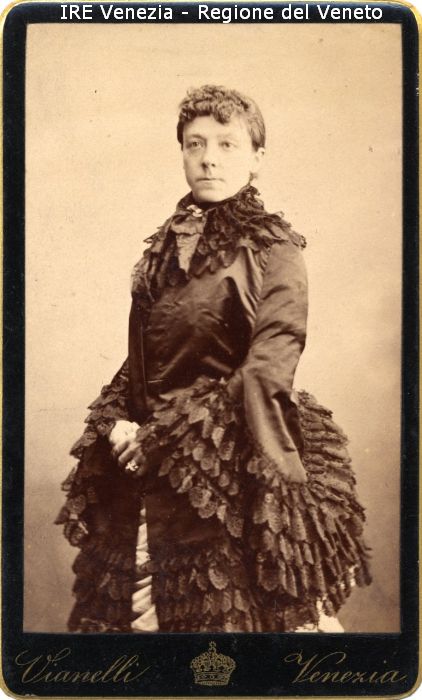 Ritratti: in studio; mezza figura; in semi profilo - Donna; in piedi, con le mani conserte - Acconciatura: capelli ricci, raccolti - Vestiario: abito chiaro, soprabito scuro - Gioielli: spilla, anello - Sfondo