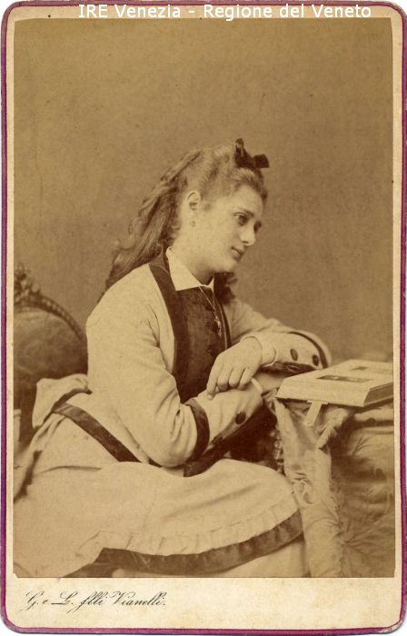 Ritratti: in studio; mezza figura; in semi profilo - Ragazza; seduta, con le braccia conserte - Acconciatura: capelli lunghi ondulati, fiocco - Vestiario: abito chiaro con bordure scure - Gioielli: orecchini, collana