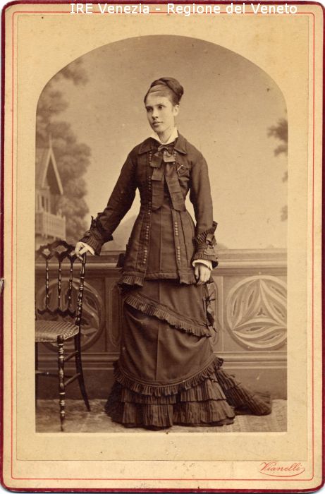 Ritratti: in studio; figura intera; in semi profilo - Donna; in piedi, con la mano destra appoggiata sullo schienale di una sedia - Acconciatura: capelli raccolti a chignon - Vestiario: abito e soprabito scuro, camicia bianca