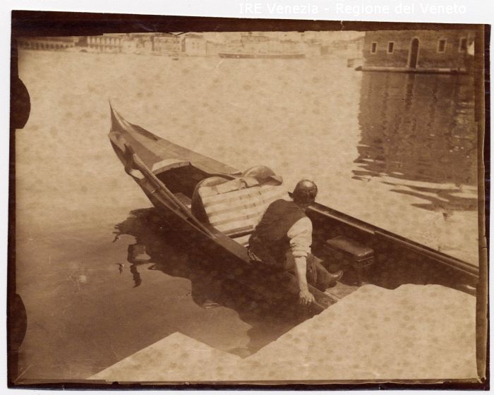 Venezia - Vita veneziana e lagunare - Scene e costumi - Estremità ovest della Giudecca - Canale della Grazia o di S. Giorgio - Gondola e gondoliere sulla riva - Veduta di Riva degli Schiavoni