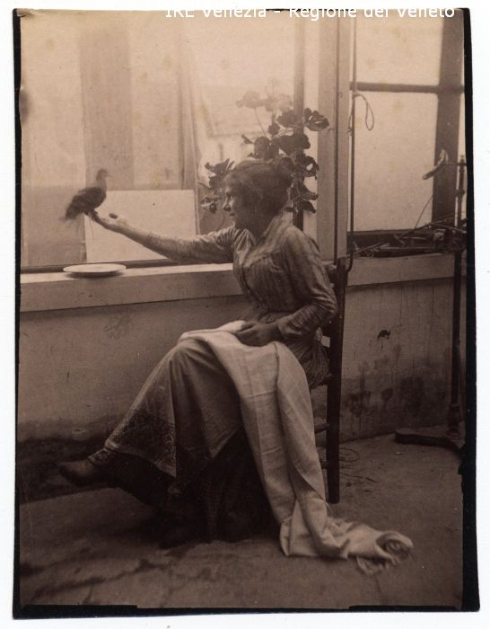 Venezia - Vita veneziana e lagunare - Modelli in posa per scene di genere - Interno (studio di Filippi ?) - Ragazza: seduta presso una finestra; con un piccione posato sulla mano destra