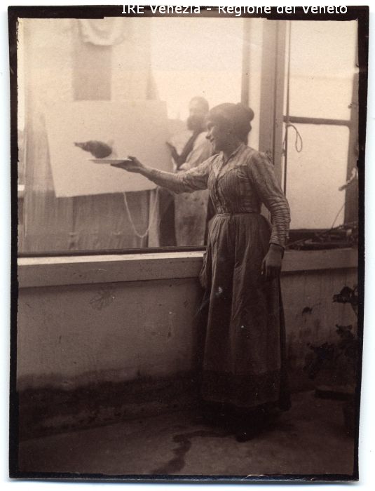 Venezia - Vita veneziana e lagunare - Modelli in posa per scene di genere - Interno (studio di Filippi ?) - Ragazza: in piedi presso una finestra; che dà da mangiare ad un piccione
