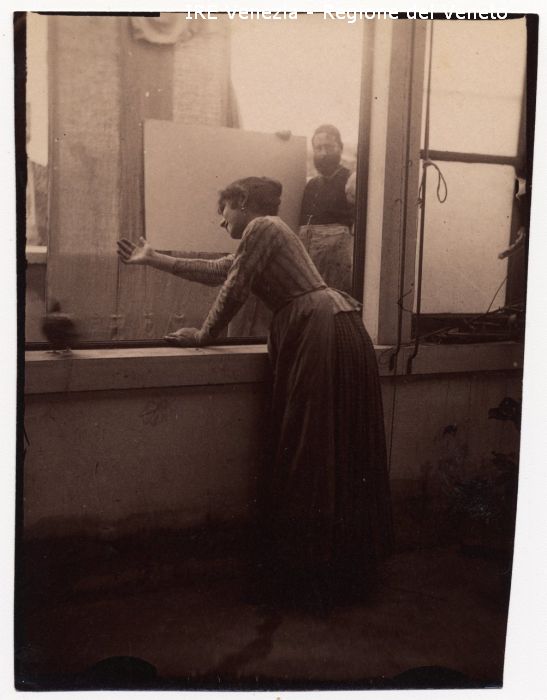Venezia - Vita veneziana e lagunare - Modelli in posa per scene di genere - Interno (studio di Filippi ?) - Ragazza: in piedi presso una finestra; che dà da mangiare ad un piccione