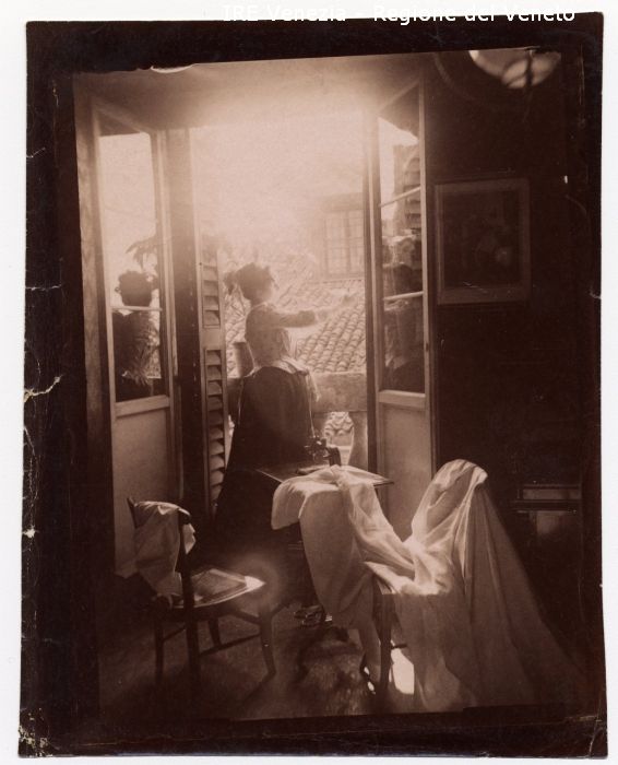 Venezia - Vita veneziana e lagunare - Modelli in posa per scene di genere - Interno (casa Filippi ?): salotto - Donna: al balcone - Tavolino da cucito - La sartina