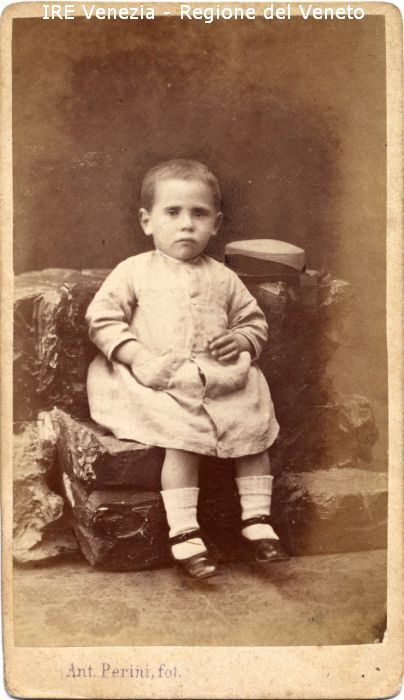 Ritratti: in studio; figura intera; frontale - Ritratto di Pompeo Rossi - Bambino; seduto su un muretto, con la mano destra in tasca - Vestiario: abito chiaro - Cappello: appoggiato sul muretto - Arredamento: muretto in pietra, tappeto - Sfondo