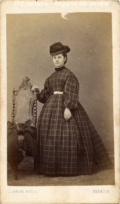 Acconciatura: capelli raccolti - Vestiario: abito scuro a quadri; cintura bianca; cappellino con piume - Soprabito: poggiato sulla sedia - Arredamento: sedia in legno intagliato, tappeto - Sfondo