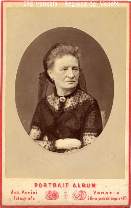 Ritratti: in studio; mezzo busto; in semi profilo - Ritratto di Carla Pavan ? - Donna: anziana; seduta, con le braccia conserte - Acconciatura: capelli ricci; velo - Vestiario: abito con velo scuro - Gioielli: orecchini, spilla - Sfondo