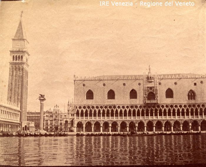 Venezia - Vedute, monumenti, luoghi - Centro storico - Bacino di S. Marco: ripreso da una gondola - Molo - Biblioteca Marciana - Campanile di S. Marco - Piazzetta - Colonna di S. Marco - Torre dell'Orologio - Palazzo Ducale - Gondole ormeggiate