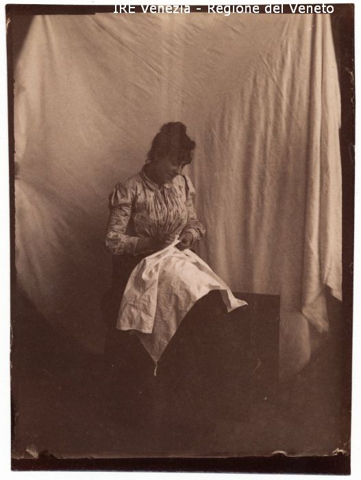 Venezia - Vita veneziana e lagunare - Modelli in posa per scene di genere - Studio su modella - Interno: studio fotografico - Donna: a figura intera; seduta, che cuce - Vestiario: elegante - Sfondo: telo bianco