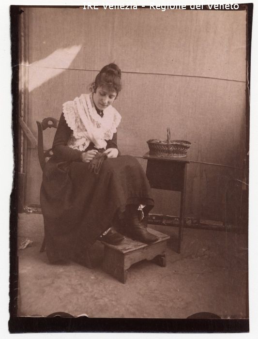 Venezia - Vita veneziana e lagunare - Modelli in posa per scene di genere - Studio su modella - Interno: studio fotografico - Donna: a figura intera; seduta, che cuce guanti - Piedi poggiati su pedana - Tavolino da cucito - Cestino da cucito