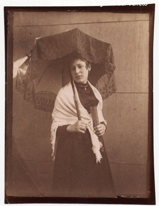 Venezia - Vita veneziana e lagunare - Modelli in posa per scene di genere - Studio su modella - Ritratto in studio - Donna: busto, frontale - Ombrello ricoperto di pizzo nero - Vestiario elegante: scialle bianco, ventaglio